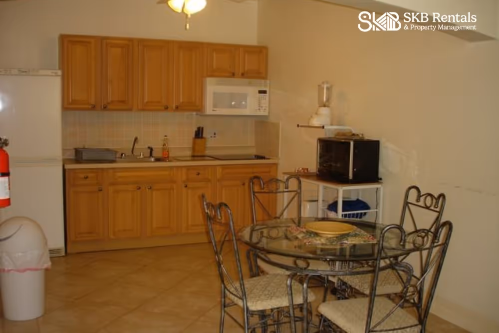 The apartment opens to a spacious studio unit with living room and kitchen area with the usual appliances (large toaster oven), comfortable seating area and TV. The room is airconditioned and has an ensuite bathroom. Windows allow for natural light and breeze.