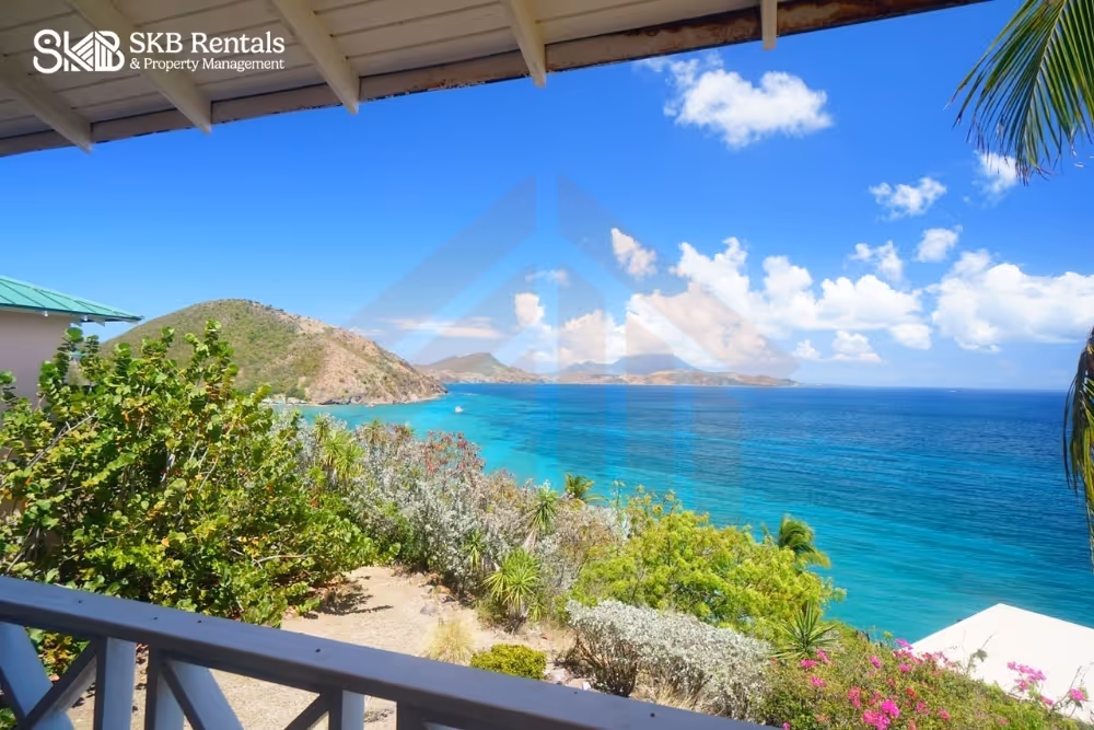This spacious 2 bedroom villa offers arresting ocean views from the entrance way throughout the villa and including both bedrooms. A parking area leads into the villa with a galley style kitchen which is well equipped and features a breakfast bar to the open plan dining room with seating for 4, and living area. Large sliding glass doors open and lead to the covered veranda and the outstanding views of the SE peninsula, Nevis and the Caribbean beyond. A guest bathroom is conveniently located on this level as well as the laundry. There is a queen size pull out sleeper sofa on this level for additional guests and this level is air conditioned for your comfort.